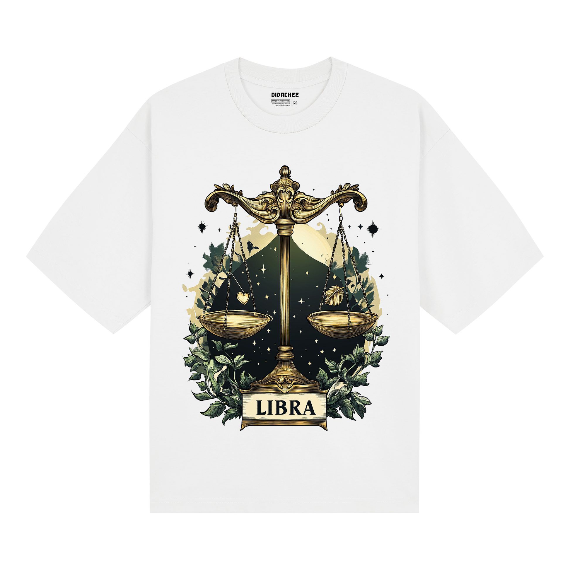 Embrace your cosmic balance with the Didachee Celestial Justice Libra Tee, detailed with elegant scales, moonlit background, and lush leaves.