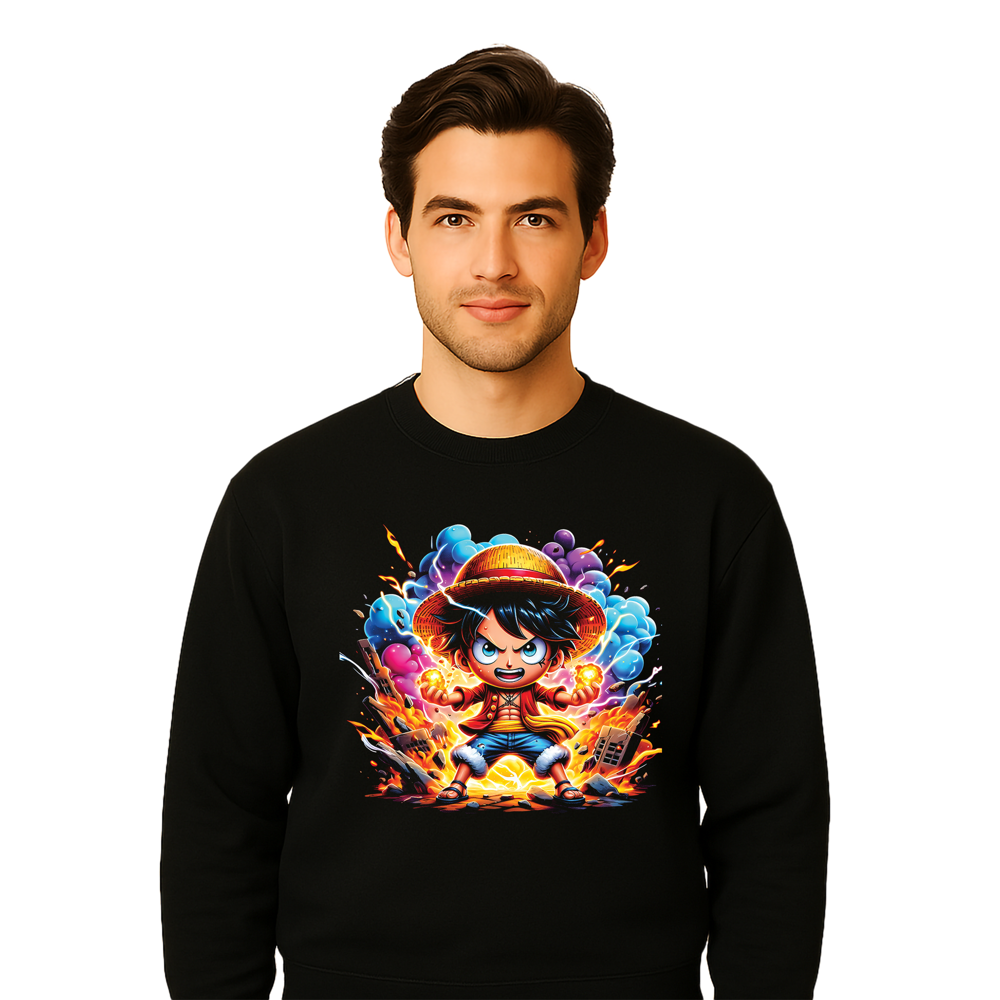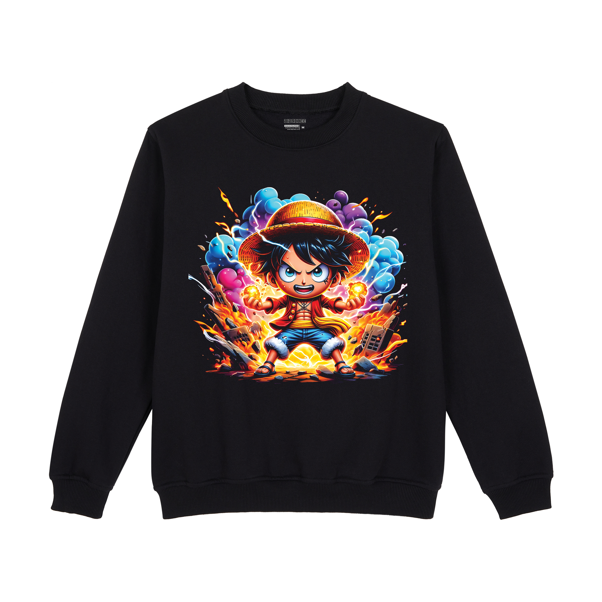 Power up with this chibi-style Luffy sweatshirt featuring fiery fists and intense determination. Playful yet fierce for true One Piece enthusiasts.