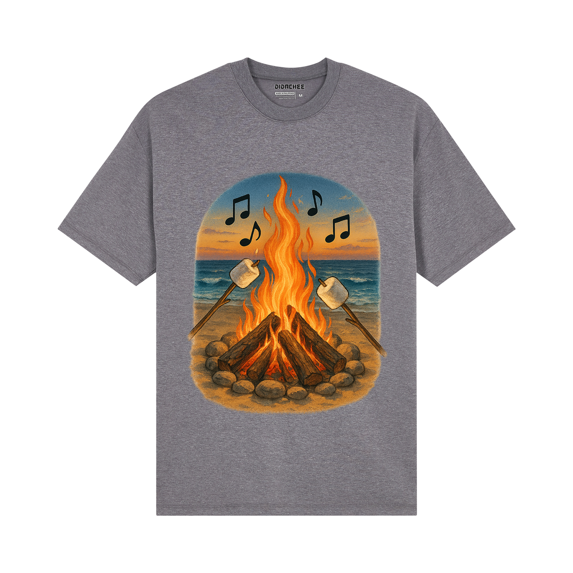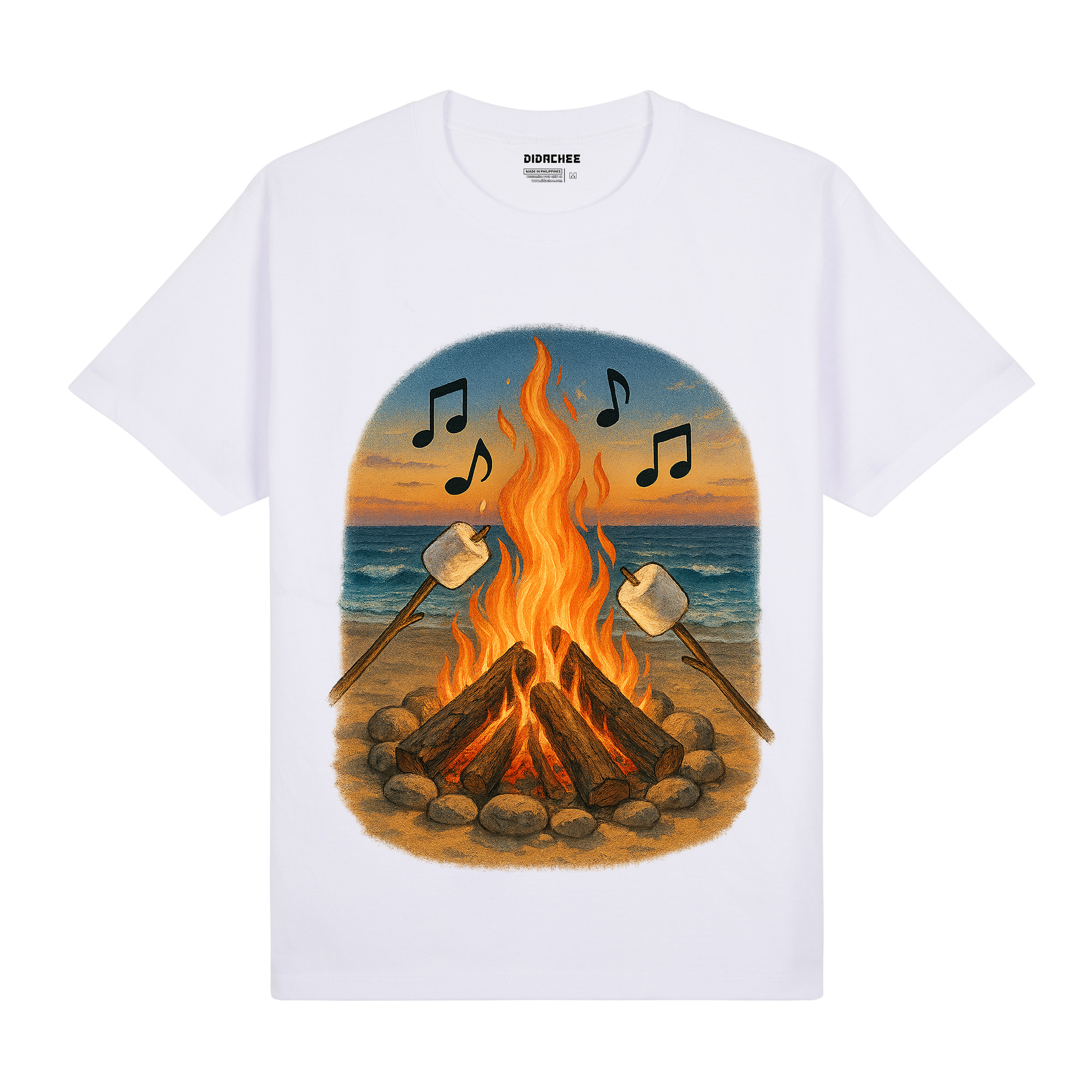 Feel the heat of the sunset and flames with this coastal campfire tee. A summer scene from Didachee.