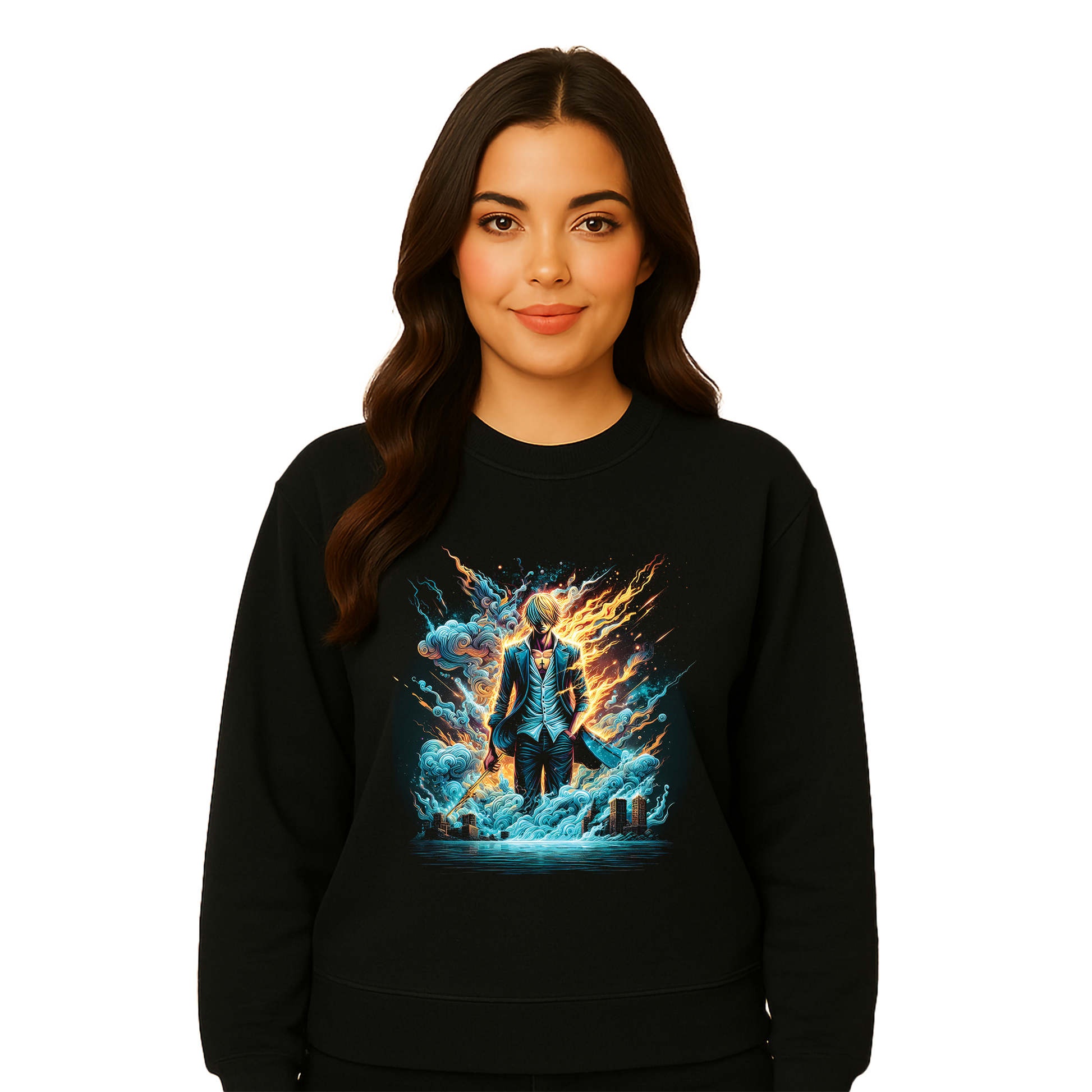 Walk through fire and smoke with Sanji in this intense One Piece sweatshirt. Cool, calm, and burning bright.